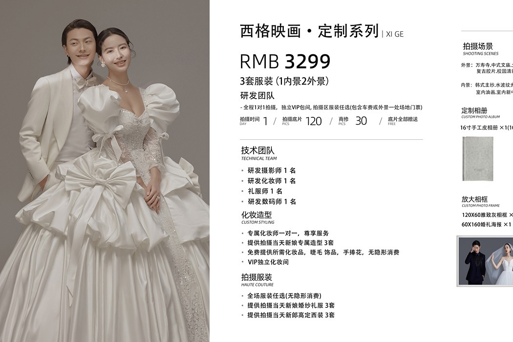 拍摄服务】 拍一套看一套,不满意免费重拍。 提供vip独立化妆间 拍摄区服装任选,无分区。 【贴心服务】 1、专业摄影师,造型师一对一服务 2、包含外景路费或门票 3、赠送登记照 4、赠送电子相册 5、赠送婚礼当天500代金券 6、婚房产品免费邮寄